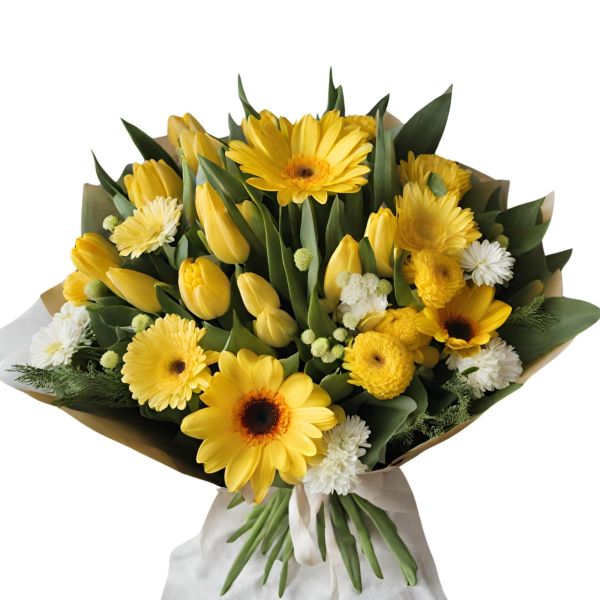 Enciende tu mundo con ‘Destello de Oro’, un hermoso ramo de gerberas y tulipanes amarillos, perfecto para irradiar felicidad y calidez.