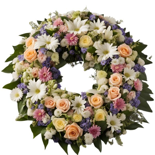 Coronas de Margaritas Blancas, Claveles, Rosas Amarillas, Rosas Rosadas, Gerberas Rosadas, Laurel, Dientes de León Blancos y Amarillos, Flores Moradas