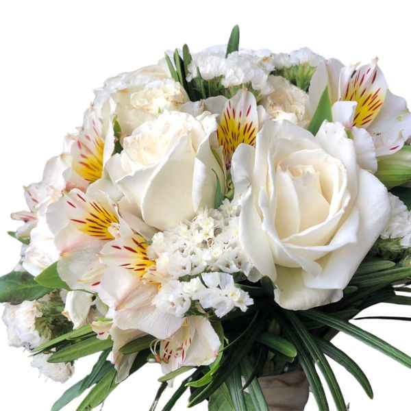Pureza Nevada: un delicado arreglo de rosas blancas, lirios y mughetto, ideal para expresar sinceridad y pureza en tus sentimientos