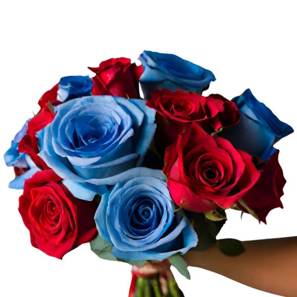 Enciende la pasión con ‘Amanecer Místico’, un hermoso arreglo de rosas rojas y azules. Ideal para transmitir amor intenso y serenidad.
