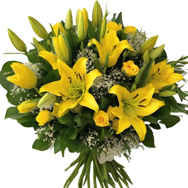 Irradia alegría con ‘Amanecer Luminoso’, un ramo de lirios, rosas Floribunda y tulipanes amarillos. Belleza y energía en cada flor.