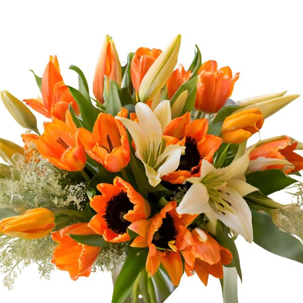 Irradia luz con ‘Crepúsculo Naranja’, un ramo de lirios y girasoles. El destello perfecto de felicidad y vitalidad en tu entorno.