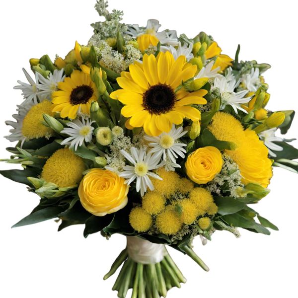 Ilumina tu día con ‘Sol Radiante’, un ramo de rosas, girasoles, dientes de león y crisantemos en tonos amarillos. Alegría pura y energía.
