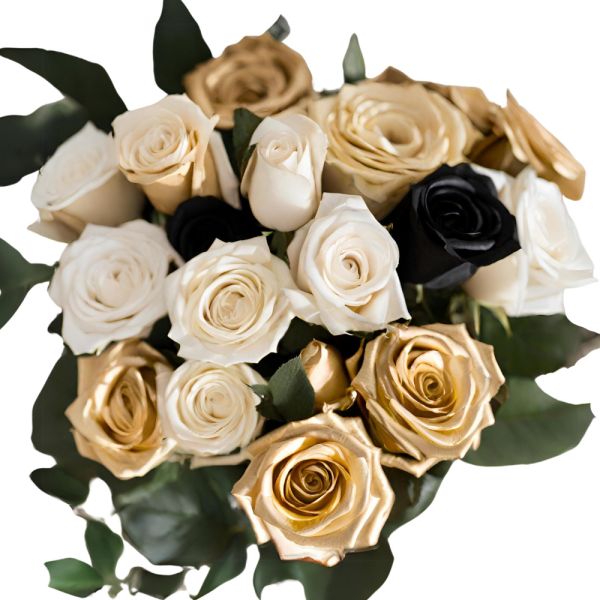 Deja una impresión duradera con ‘Elegancia Sin Fin’, un lujoso ramo de rosas doradas, blancas y negras. Ideal para mostrar sofisticación y elegancia.